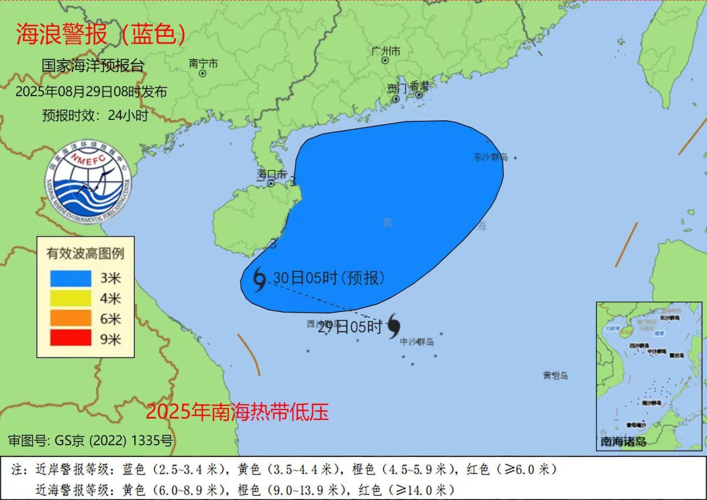 海浪方面,受南海热带低压的影响,预计8月29日上午到30日上午,南海北部将出现2.8到3.8米的大浪区;海南东部、南部近岸海域将出现2到3米的中浪到大浪,近岸海域海浪预警级别为蓝色。请在上述海域作业的船只注意安全,沿海各有关单位提前采取防浪避浪措施。