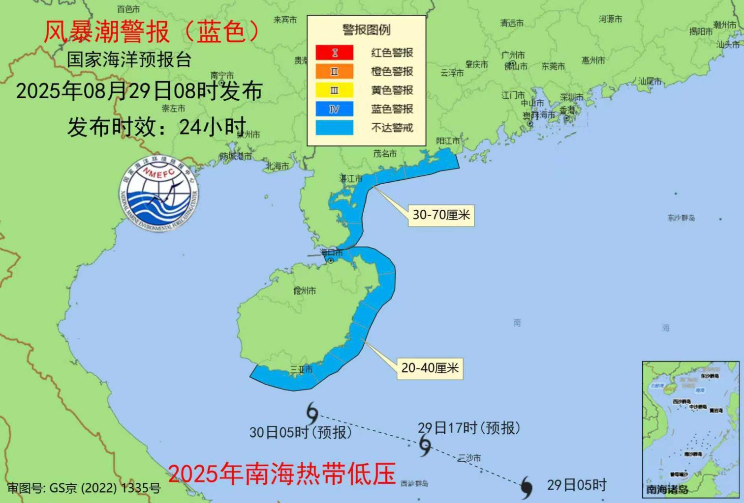 风暴潮方面,受南海热带低压的影响,预计8月29日上午至30日上午,广东阳江至湛江沿海将出现30到70厘米的风暴增水,海南岛北部、东部和南部沿海将出现20到40厘米的风暴增水。上述岸段内的潮位站将不会出现达到当地蓝色警戒潮位的高潮位。风暴潮预警级别为蓝色。
